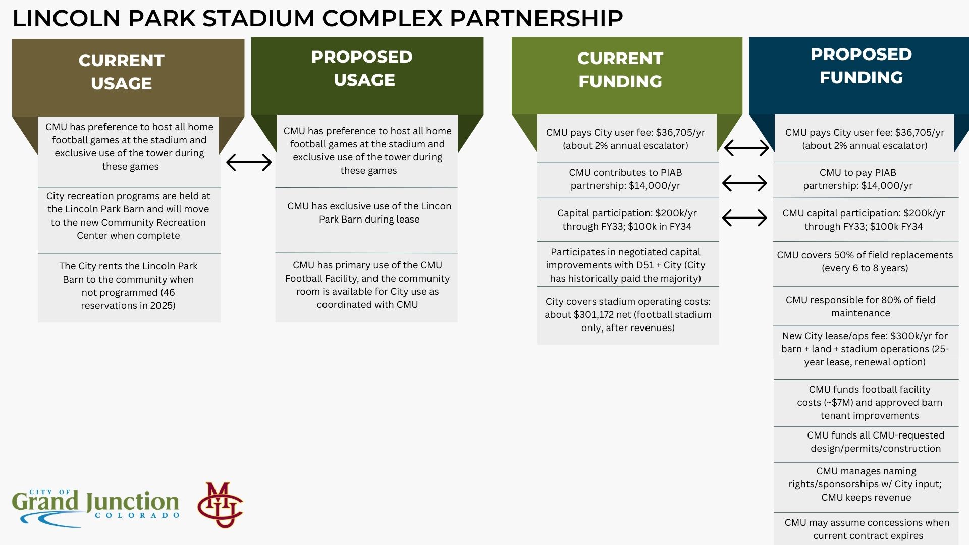 The proposal outlines that the City would continue to own the Lincoln Park Sports Complex. The plan under discussion includes a lease limited to the football facility project site, while preserving traditional stadium uses by D51 and other partners, keeping public access to the track during scheduled times, and adding enhanced amenities funded by CMU. It would also include an estimated $7 million CMU investment in improvements to City-owned property. CMU would take on additional long-term operations and maintenance responsibilities, including turf repair and replacement at Stoker Stadium, and would make a $300,000 annual lease/operations payment to cover operating costs currently paid by the City. This work would also provide a long-term use for the Lincoln Park Barn as part of the overall Stadium Complex, as most current bookings would transition to the Community Recreation Center once it opens, as planned.